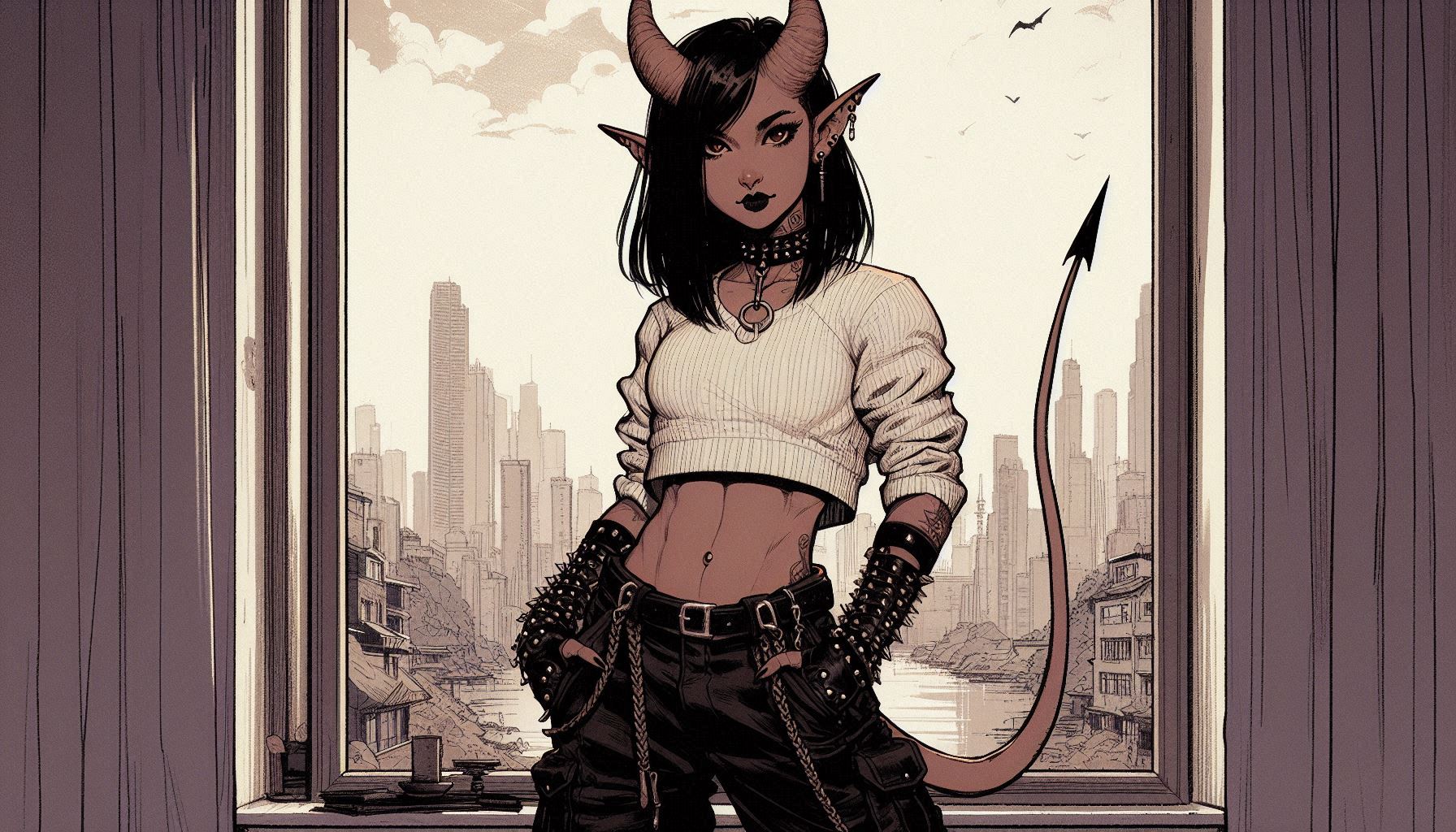 Appearence: She is in very good physical shape and used to be on the move and work a lot. Her skin can be described as tanned but also has a slightly ashen or gray touch to it. She has black hair, that she keeps short and usually bound into a ponytail to keep it out of her eyes. She has short, back-swept horns, long pointed ears and a very flexible prehensile tail. She also has pointed fangs and generally sharp teeth.