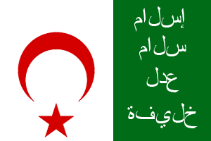 - Flagge: Eine rechteckige Flagge mit zwei Hälften: Grün (rechts) mit der Inschrift „Islam, Friede, Gerechtigkeit, Kalif“ in raplarischer Schrift und Weiß (links) mit einem abwärts zeigenden Halbmond und einem Stern.