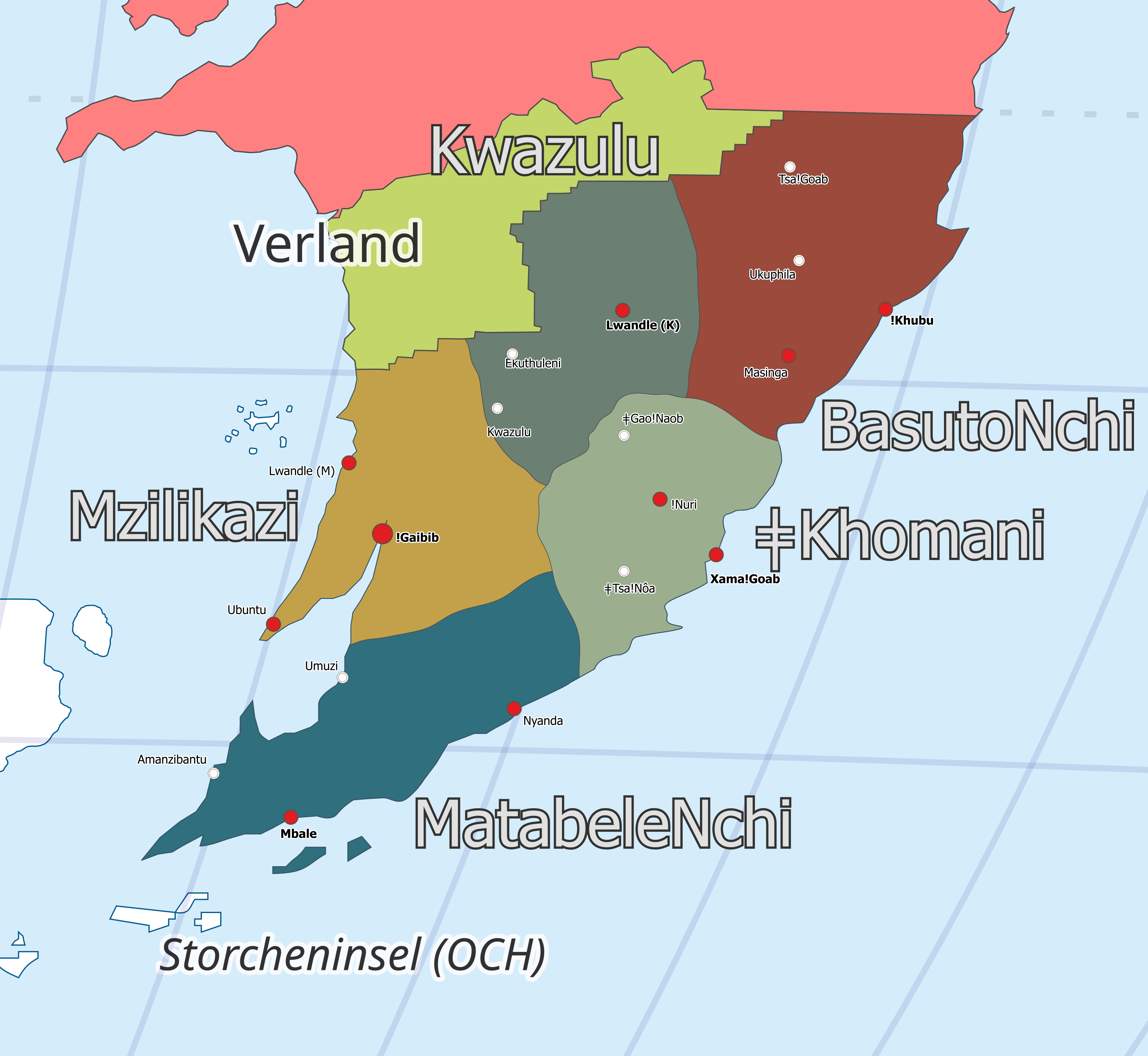MatabeleNchi ist ein großer südlicher Küstenstaat und eine der tragenden Seefahrts- und Wirtschaftsmächte der UManyano. Über Jahrhunderte gewachsene Traditionen des Schiffbaus, begünstigt durch reichhaltige Wälder und gesicherte Rohstoffketten, prägen bis heute Industrie, Arbeitskultur und staatliches Selbstverständnis. Maritime Infrastruktur, Werften und Handelsrouten sind hier nicht bloß Wirtschaftszweige, sondern Teil kollektiver Identität.